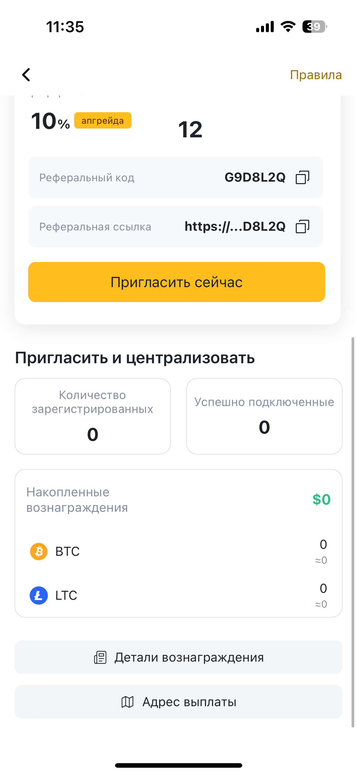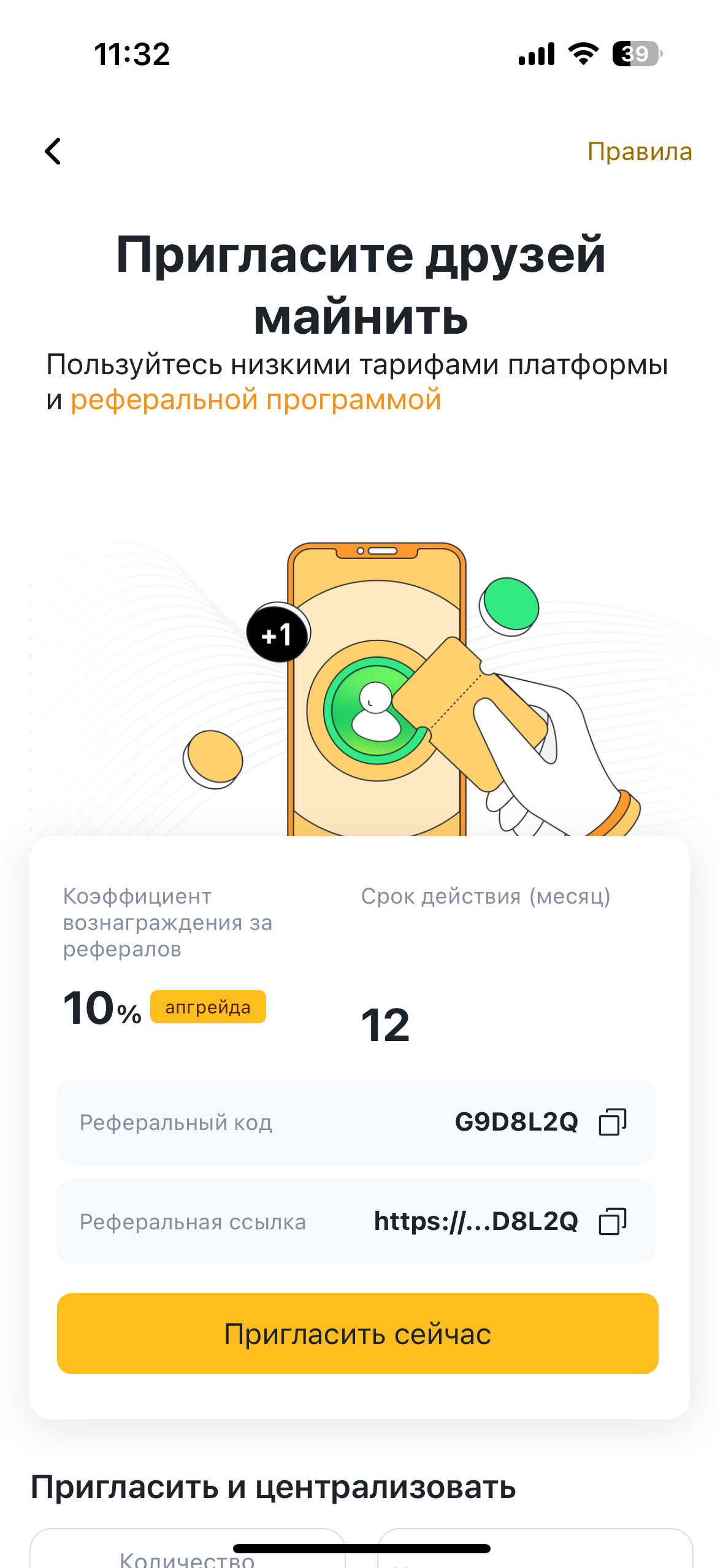 Участие начинается с мобильного приложения или личного кабинета на сайте, где вы находите свой персональный код или ссылку для приглашений. Когда новый пользователь регистрируется по вашей ссылке и подключает хешрейт, вы начинаете получать вознаграждение.